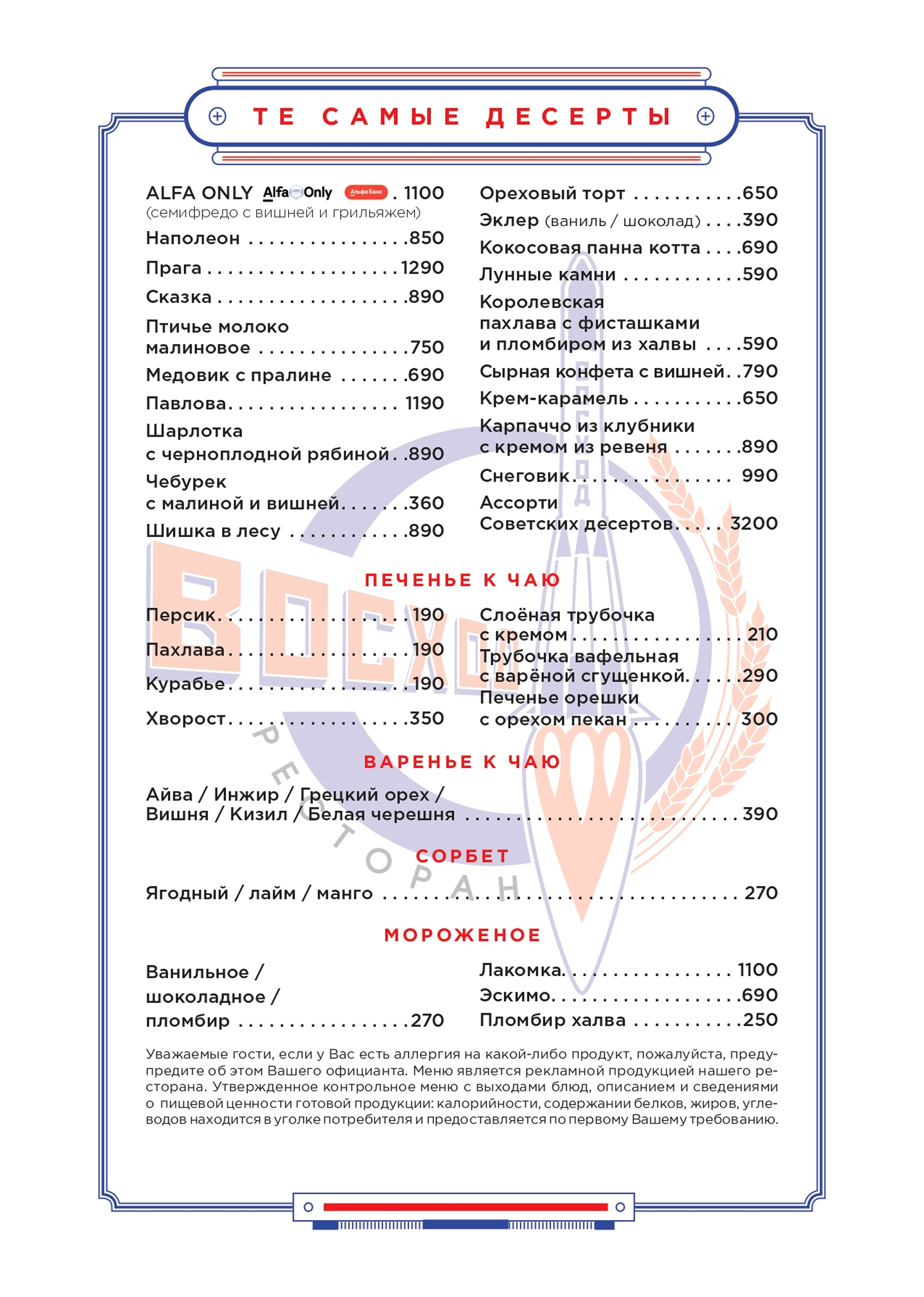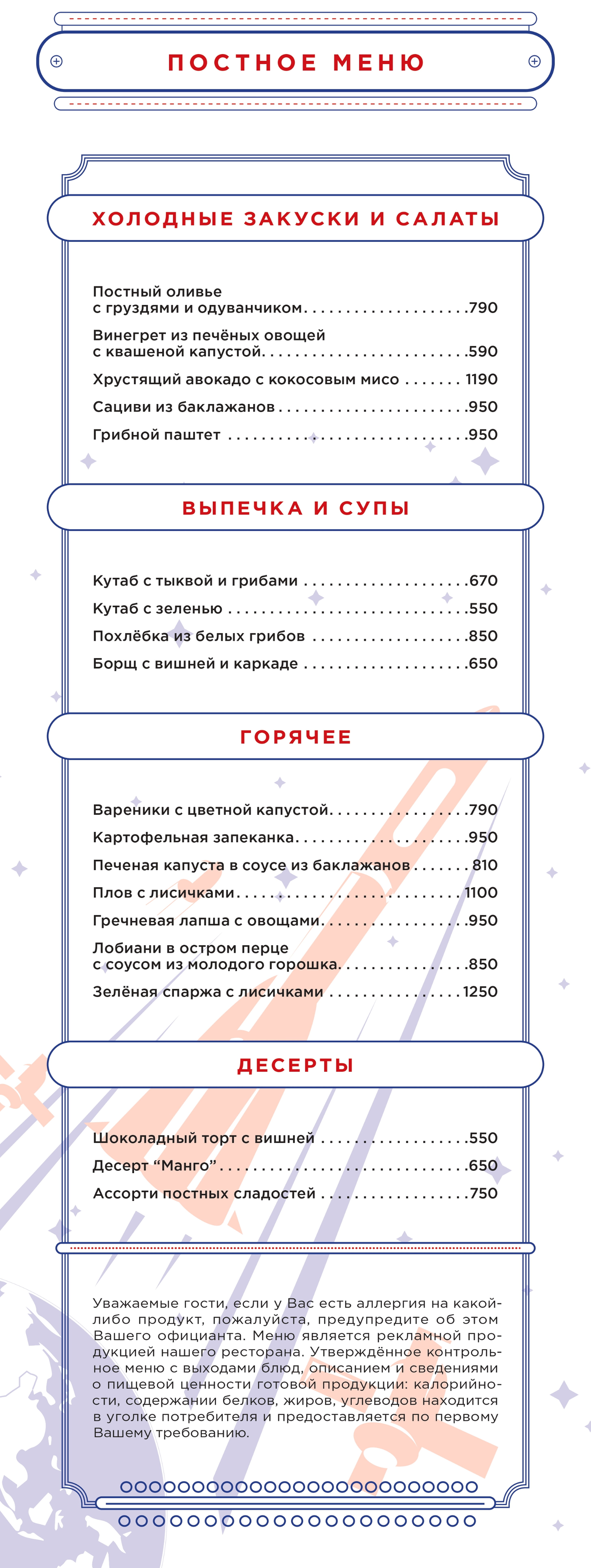 Уважаемые гости, если у Вас есть аллергия на какой-либо продукт, пожалуйста, предупредите об этом Вашего официанта. Меню является рекламной продукцией нашего ресторана. Утвержденное контрольное меню с выходами блюд и сведениями о пищевой ценности готовой продукции: калорийности, содержании белков, жиров, углеводов находится в уголке потребителя и предоставляется по первому Вашему требованию.